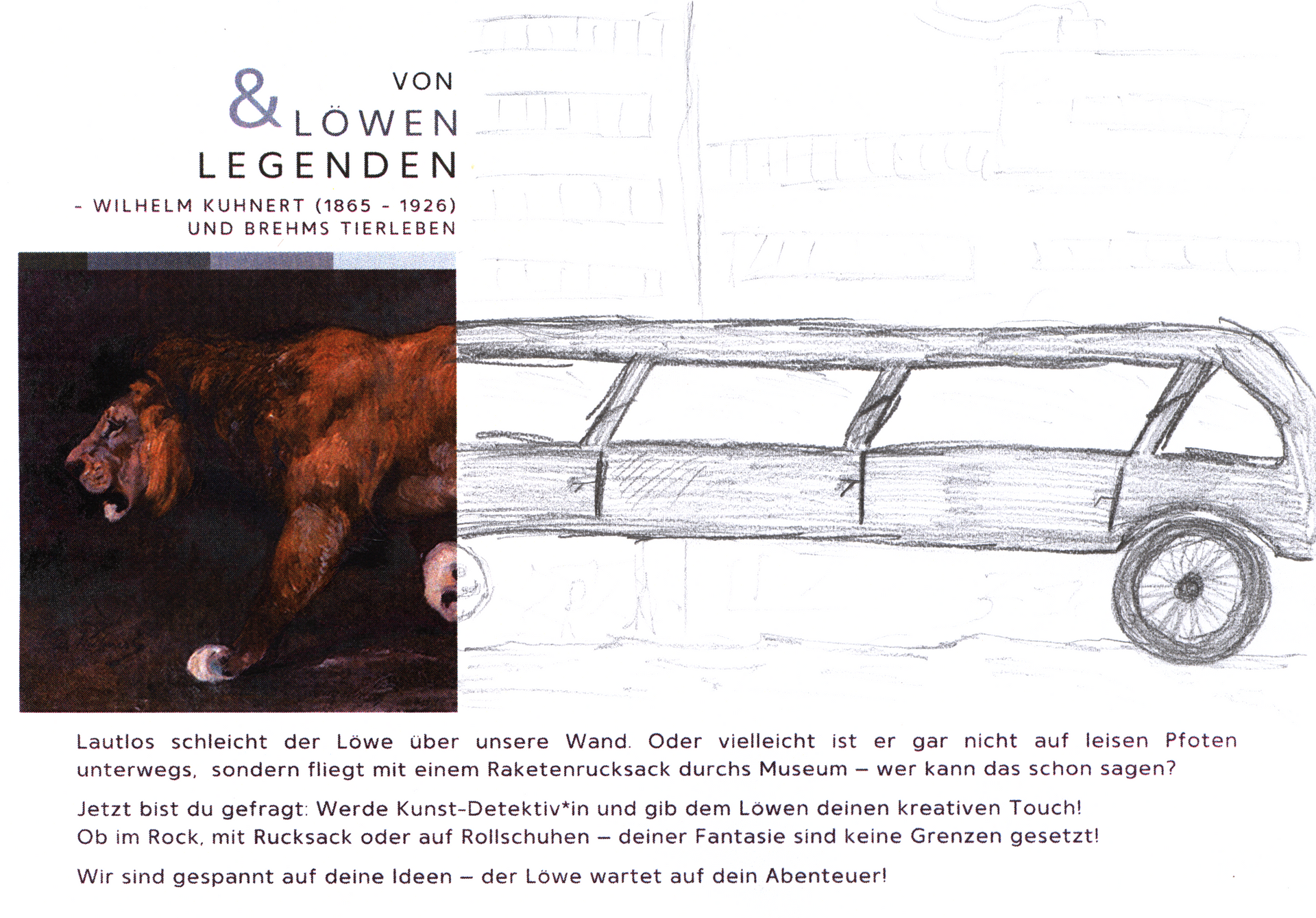 BREHMS WELT – Tiere und Menschen lädt herzlich zur Eröffnung der Ausstellung „Von Löwen und Legenden - Wilhelm Kuhnert und Brehms Tierleben“, die vom 25. Januar – 27. April 2025 zu sehen sein wird, ein. Diese Sonderausstellung würdigt insbesondere die beeindruckenden grafischen Werke von Wilhelm Kuhnert, einem der prägenden Illustratoren des berühmten Brehms Tierlebens.