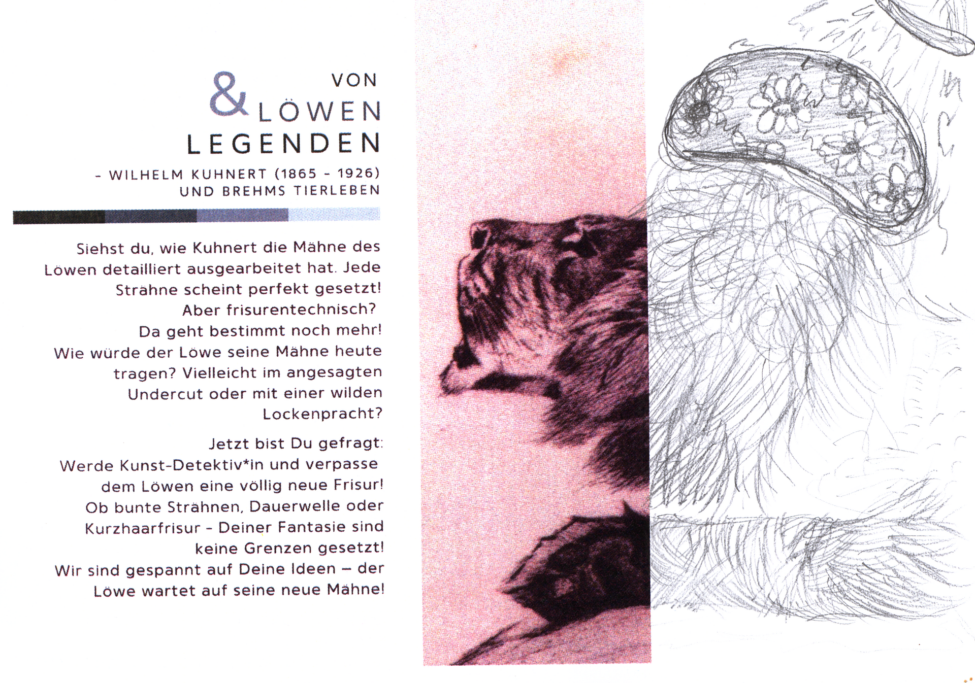 Werde Kunst-Detektiv*in und vervollständige die Werke aus unserer Sonderausstellung. Verpasse dem Löwen eine neue Mähne und setze das Äffchen neu in Szene. Deiner Kreativität sind keine Grenzen gesetzt. Das Material zum Download findest Du unter den Beispielbildern.